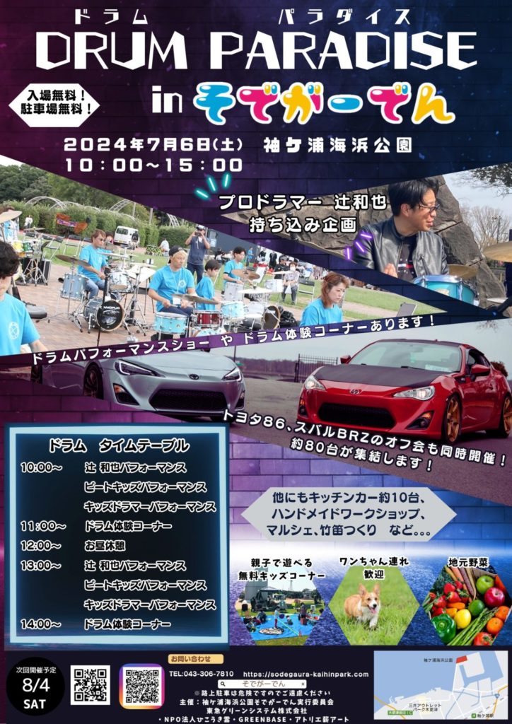 今回の袖ケ浦海浜公園そでがーでんのテーマは「DRUM PARADISE in そでがーでん」です。ドラムパフォーマンスをお楽しみください。
